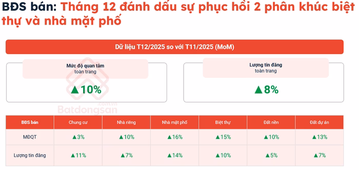 Tháng 12/2025, thị trường bất động sản ghi nhận sự hồi sinh đáng chú ý ở hai phân khúc cao cấp: biệt thự và nhà mặt phố.
