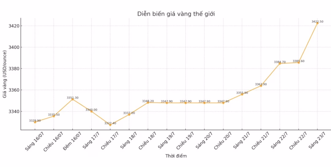 Giá vàng thế giới đã tăng mạnh trong thời gian gần đây, đạt mức cao nhất trong 5 tuần và đang chuẩn bị thách thức kỷ lục mọi thời đại. Hợp đồng vàng giao tháng 8 đã tăng vọt 37,40 USD, đạt 3.443,8 USD/ounce, mức cao nhất kể từ khi vàng lập kỷ lục 3.452,8 USD/ounce vào ngày 13.6.