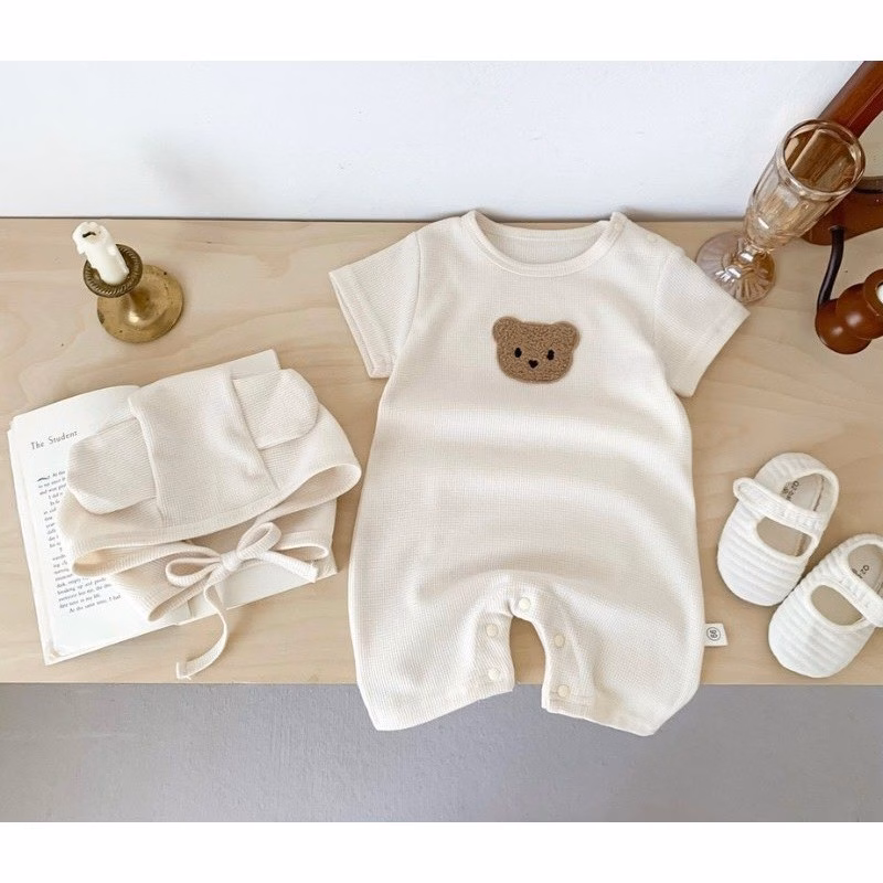 🔥 [KÈM MŨ] Bodysuit Cho Bé Trai, Bé Gái Sơ Sinh Từ 3-12kg KAMSAMITA Vải Thun Tăm Đính Gấu, Body Ngắn Tay Cho Bé S443 đang giảm giá!