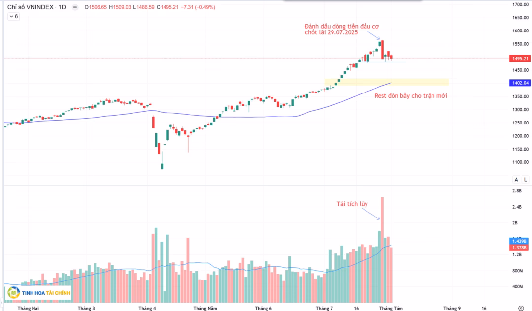 Giai đoạn tái tích lũy này có thể được so sánh với giai đoạn năm 2020, khi thị trường tiệm cận mốc 1200 điểm. Các tín hiệu hiện tại cho thấy thị trường đang trong giai đoạn rung lắc, với 5/5 yếu tố cho thấy sự điều chỉnh. Việc trao cung diện rộng của thị trường đã xuất hiện vào phiên 29.07.2025. Trong bối cảnh này, nhà đầu tư cần thận trọng khi sử dụng đòn bẩy (margin) và quản lý quy mô danh mục đầu tư.